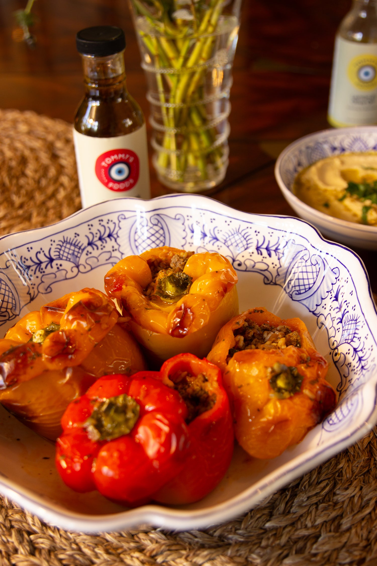 and fresh parsley. Turn your pan to medium-high heat, add olive oil, and sauté onions until golden. Next, add the ground beef and cook until almost done. Stir in your white rice, followed by all the shredded veggies. Give it a good mix. Add dried mint, tomato paste, garlic, crushed tomatoes, and broth. Season with salt and pepper. Then, add a touch of honey to bring it all together. Now, drizzle Tommy’s Spicy Greek Dressing over the pan. Open up your peppers and get them ready to fill. After stuffing, drizzle with more