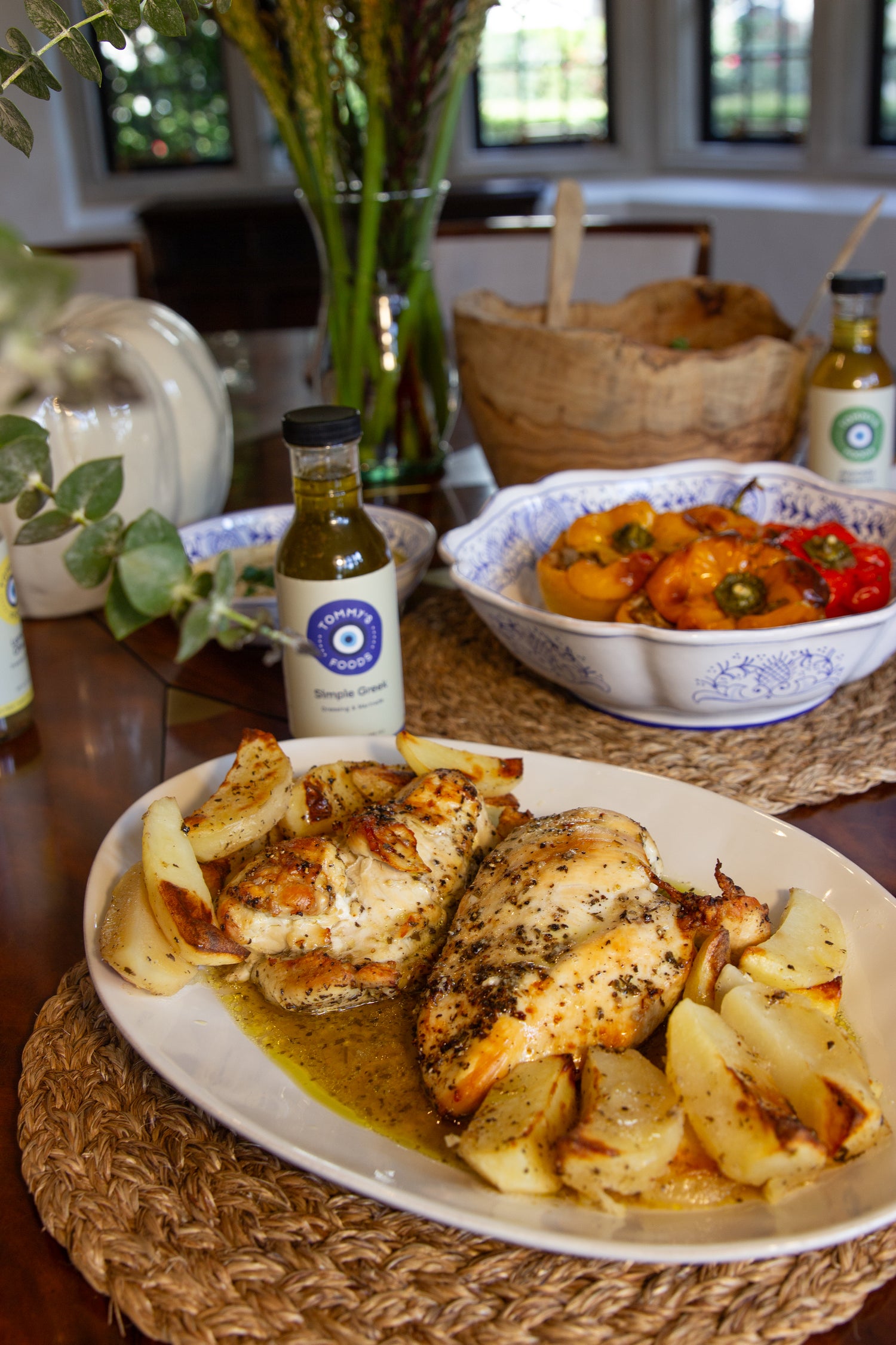 Marinate chicken with Tommy's Simple Greek dressing. Place chicken and potatoes in a pan, then sprinkle salt and pepper. Pour more Simple Greek over potatoes and mix. Pour broth into pan. Put into oven at 400 degrees for 40–45 minutes, or until