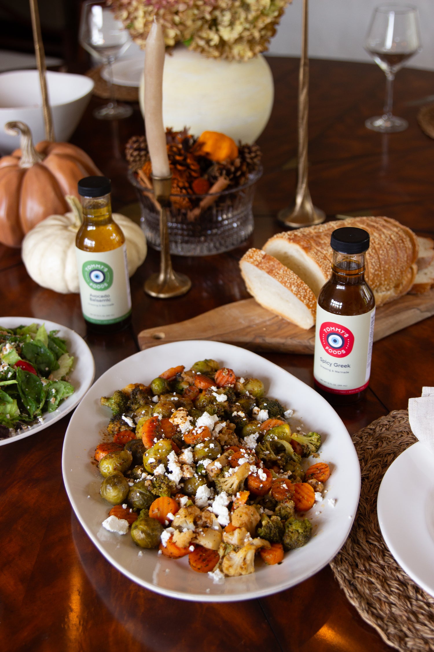 Preheat oven at 450 degrees F. Place vegetables in bowl, pour Tommy's Spicy Greek and mix. Spread on cookie sheet and bake for about 30 minutes. Plate and sprinkle with feta cheese and salt.
