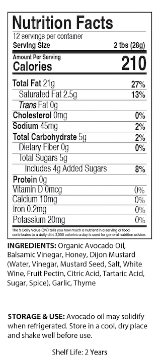 Avocado oil, balsamic vinegar, honey, mustard (water, vinegar, mustard seed, salt, white wine, fruit pectin, citric acid, tartaric acid, sugar, spice), garlic, thyme.