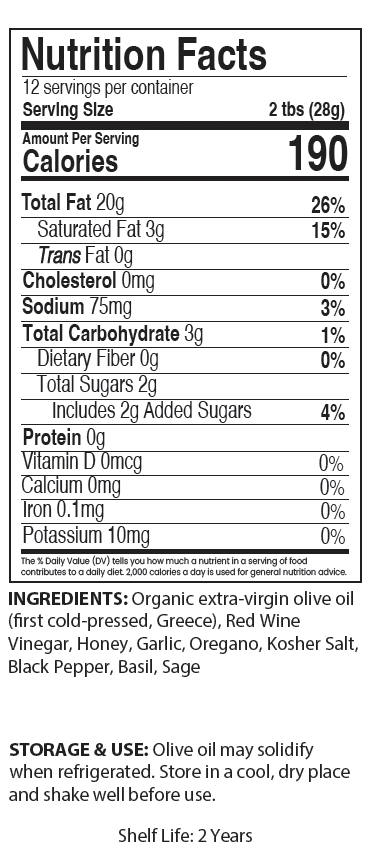 Organic extra virgin olive oil (first cold-pressed, Greece), red wine vinegar, honey, garlic, oregano, kosher salt, black pepper, basil, sage.